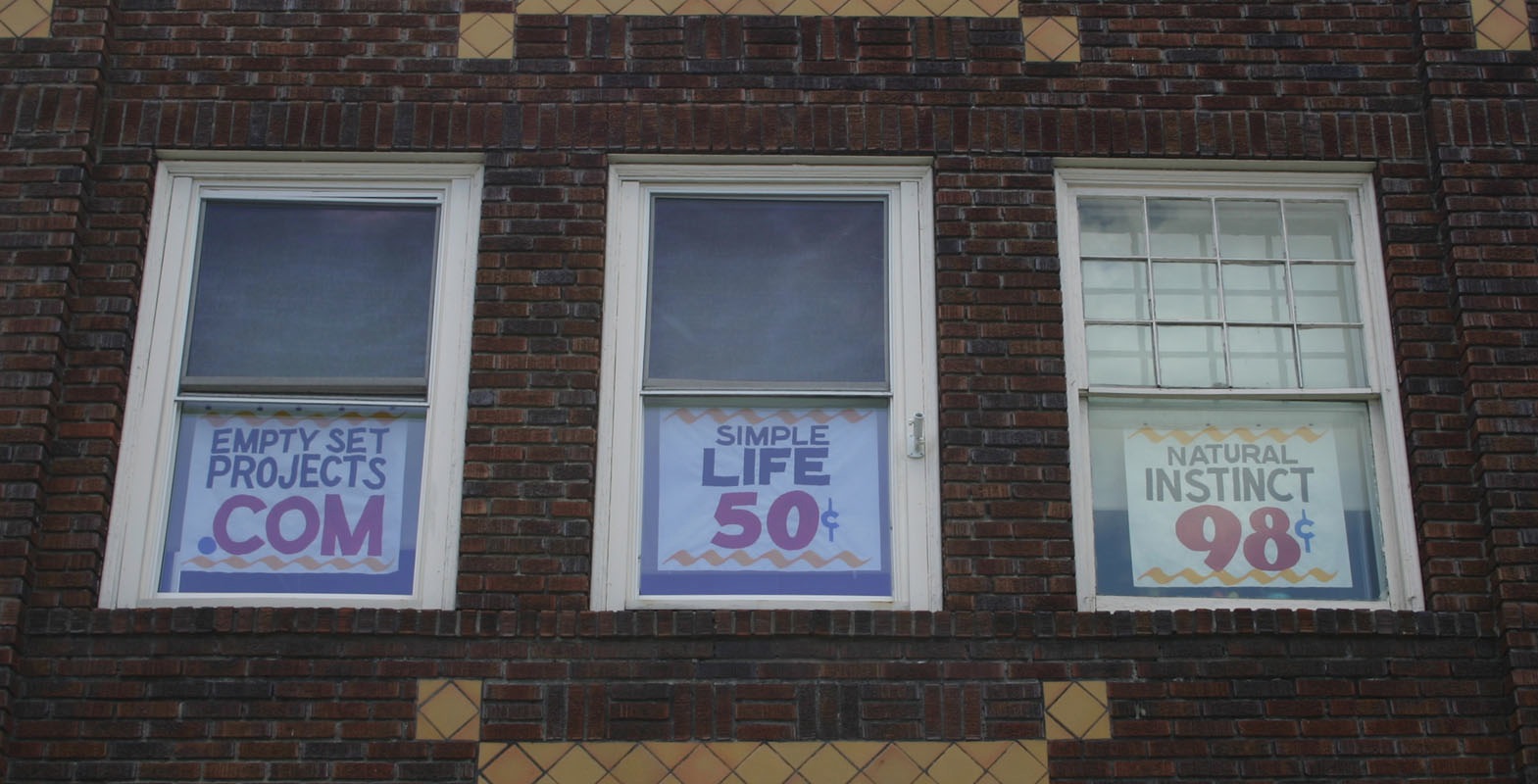 I don’t travel much, but when I do, I head to Massachusetts and Vermont. My father lives in Vermont. Idling at a stoplight, from my view in the passenger seat, I look up and see The Empty Set Project signs…Crafted purposely to look like the old hand-painted grocery store posters of yesteryear, SEE ABOVE with witticisms that are simplistic but make you think. Upon first glance they do seem like store signs but when you really look (I’ve been looking forward to their new posters for years and they change them regularly, it’s always amusing and intriguing) that’s when you notice the ‘odd’ things for sale. But I have to show you more for you to understand…Keep in mind these windows are up a few floors so you have to look up to notice them. I think that’s the point. Really look at the world. That’s the only way.