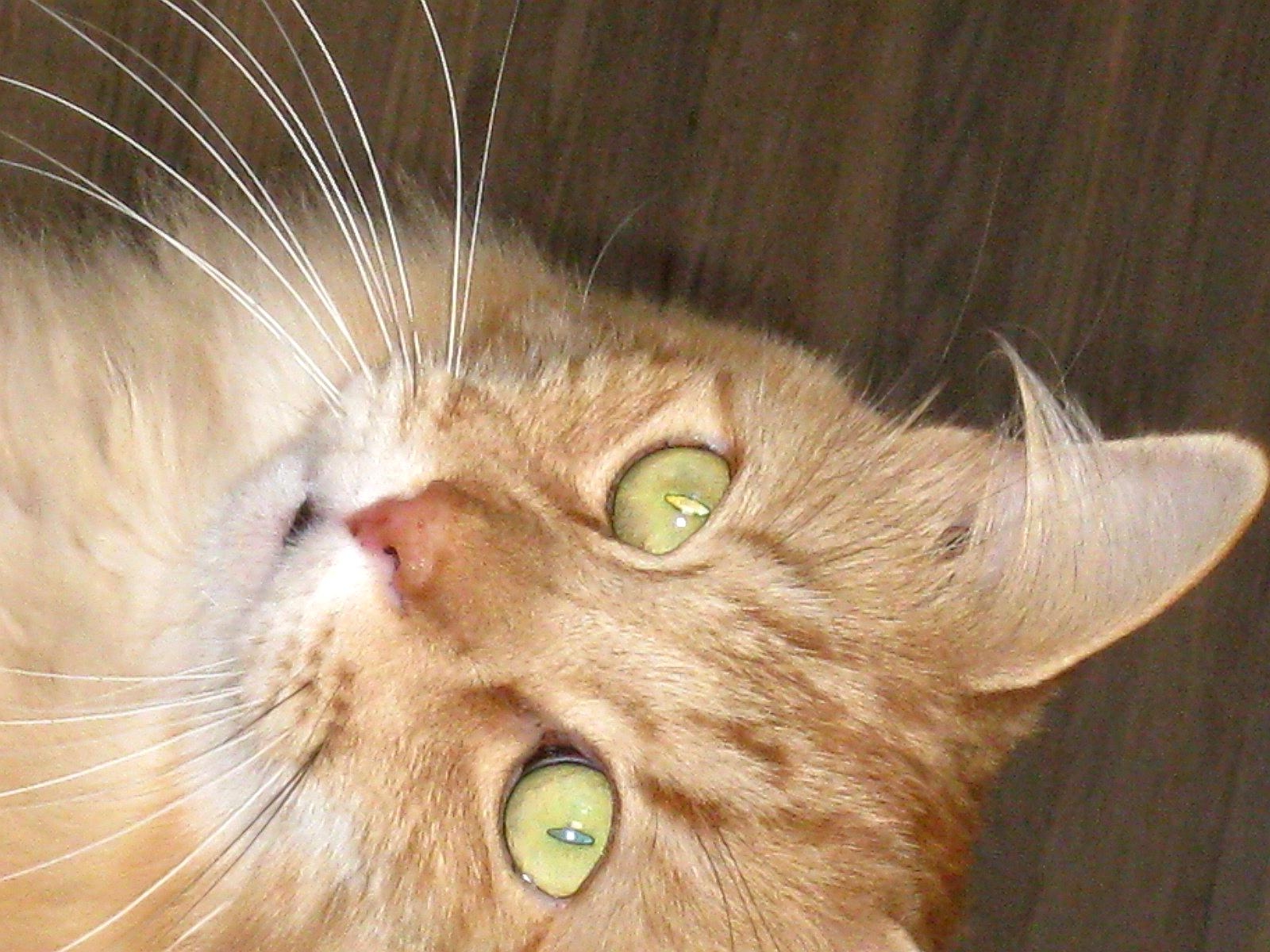 Good old Mister Po, my current kitty. He was brought to my attention by a neighbor in 2002 who saw a stray (feral) mother cat abandon two kittens so young they were nearly hairless, on her front porch. To my neighbor’s horror, she saw a hawk snatch up one kitten and fly off with it. If I hadn’t taken Po in, he would’ve been a goner. He was so floppy and tiny that his wee head, not unlike a baby bird’s, lolled on his teeny neck. I nursed him with a baby bottle and miraculously he grew. When my dying husband had a feeding tube put in, I used dribbles and drops from his highly nutritional Boost drinks to supplement Po’s diet. He got his shots at the vet and thrived. Today he has a beautiful long-haired coat and is a sweetheart.