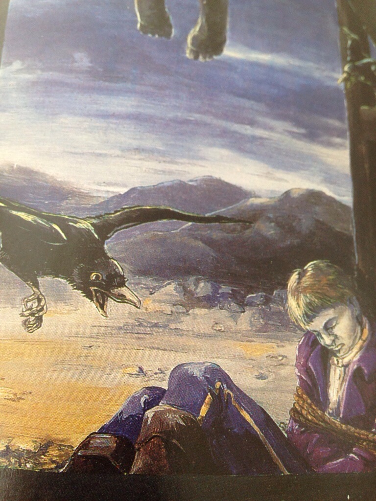 This tale involves crows telling tales to each other of burning frogs and sick princesses while perched upon the gallows above a bound hanging man. And they peck people’s eyes out. But in their defense, they do peck out the eyes of the bad guys.