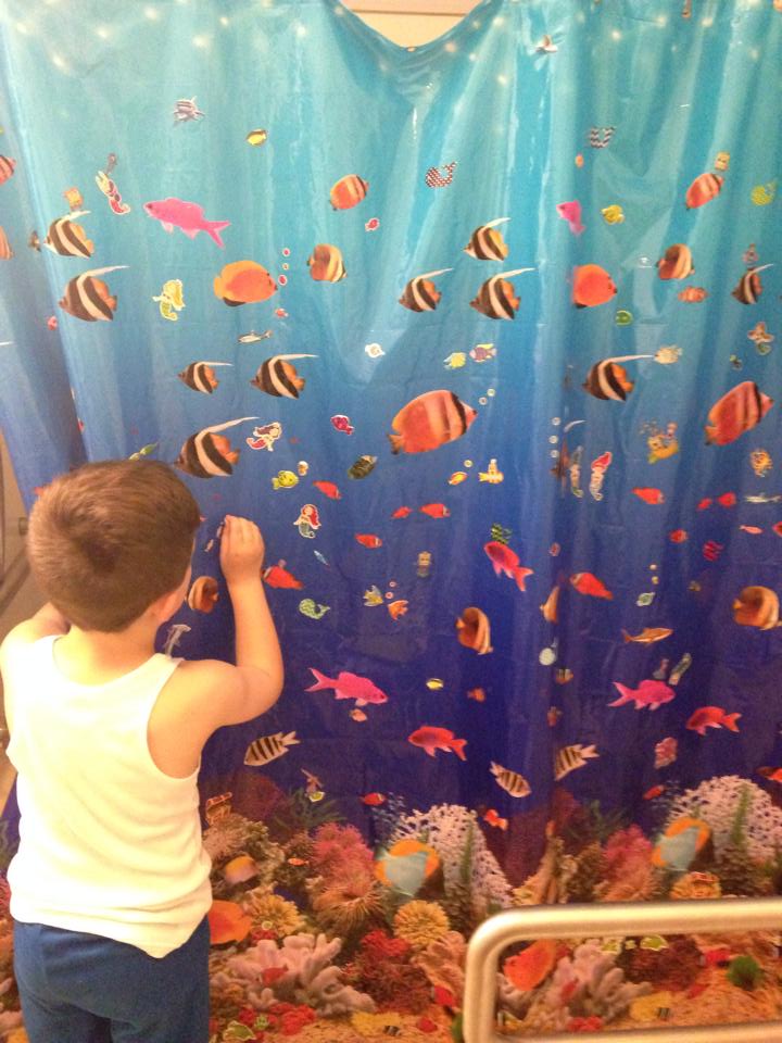 This is my bathroom shower curtain. The curtain was purchased at Walmart.As you can see, it’s an oceanic world, an underwater scene of fish and coral. Every week I buy stickers and when my grandson sleeps over, he puts them into the scene. My favorite is the Spongebob and Patrick you see here catching a ride on a colorful fish. I also like the pirate ship we put into the scene which we’ve balanced on a piece of coral. With stickers, getting things to ‘scale’ is optional! The pirate ship sticker came from a kids’ meal at KFC.