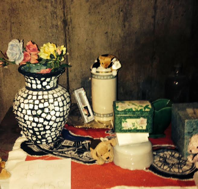 So I’ve been passing by this urn display for many years, where they are on a table in my basement. I pause sometimes, with my laundry basket on my hip before I head back up the stairs and I talk to one or another of them. This is ridiculous because they don’t reside there in the urns. They’re everywhere but there, where their physical vessels have been left behind. They’re in my dreams, heart, and thoughts, all around me, a mere molecule away. Why then, do I keep them? I don’t “need” a monument to them, a “place” to go to think of them. Right?
