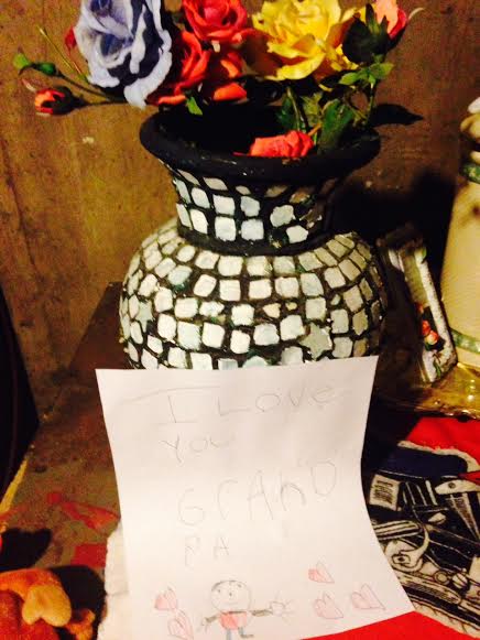 I carried it home (uphill, I don’t drive) and decorated (I was in a mosaic phase) it. I always meant to find something else to keep him in but I never did. The note says: I love you Grandpa, a note from a grandson he never met.