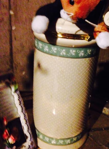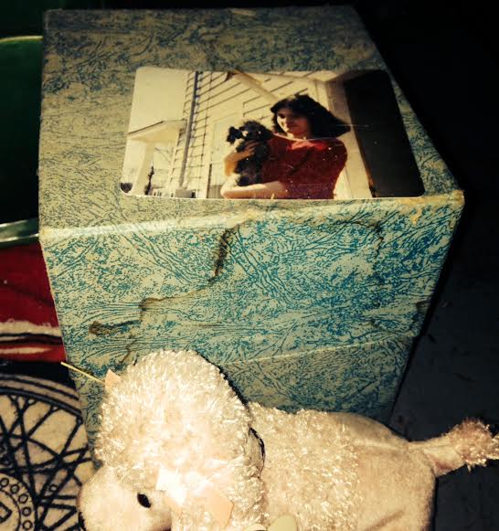 Okay so I acquired the first one in 1982. I was 17 when my poodle Suzette died mysteriously on St. Patrick’s Day; one cold March morning. She was let out to do her duty and dropped to the ground apparently. My father carried her inside. She died in my arms on the kitchen floor while I was on the phone to the vet. She’d been found by the mailbox out front. When the snow finally thawed a few weeks later, I found her dog tag on the ground. Did a car slide on ice and knock her over? Because I can’t figure out how her tags ended up on the ground. Or did she die of old age? She never went in the road…Anyway I had her cremated and put in this blue box, which you can see has water damage because after all it’s over thirty years old.