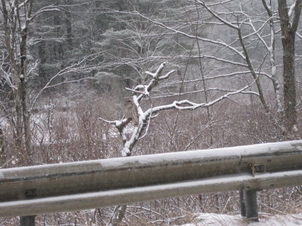 Al and I were headed to Vermont one weekend when he pulled over and snapped this picture of an owl he spotted by the side of the road. Don’t see it? Here’s a close-up.