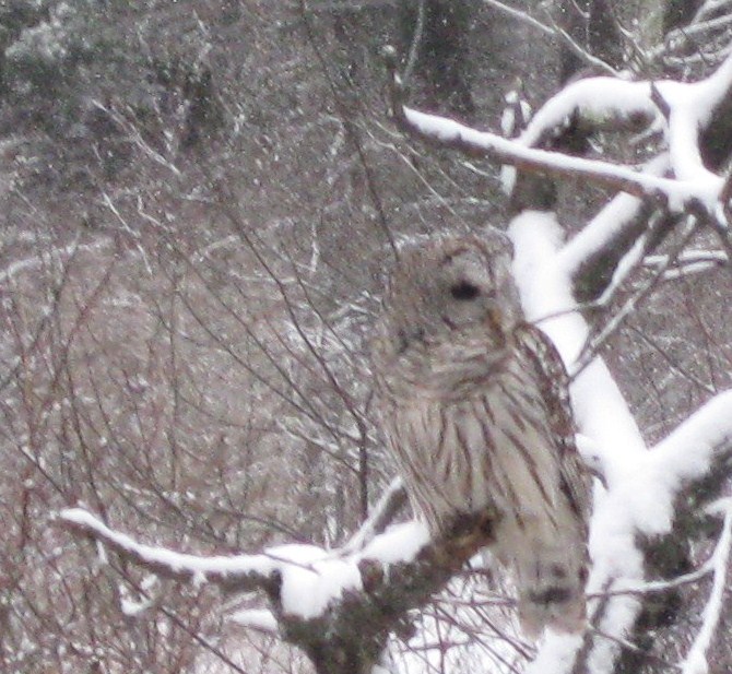 I’ve seen eagles fly over, bluejays with strong personalities, redheaded woodpeckers, crows on garbage days of course, mourning doves, starlings, robins, hawks… and occasionally a turkey family trotting through as well as other birds. But somehow an owl sighting in the middle of the day seems special. I don’t know why. I suppose because I don’t see them often.