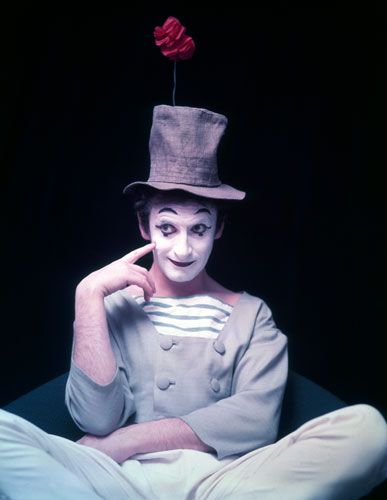 His character “Bip,” the clown (based on the 19th-century French Pierrot) in his battered deflowered opera hat and striped pullover had numerous misadventures that captivated the world. I like that. Captivating the world and not uttering a single word aloud. Marceau made miming a true silent art.