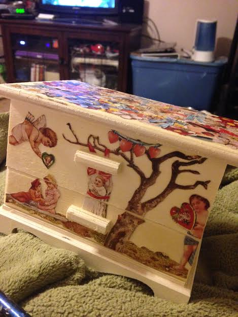 Decoupage: The art of cutting out images from paper and affixing them to surfaces with a clear glue, in this case: Mod-Podge. One of my most favorite things to do! Below, here is a picture of my box about 8 hours into the project: