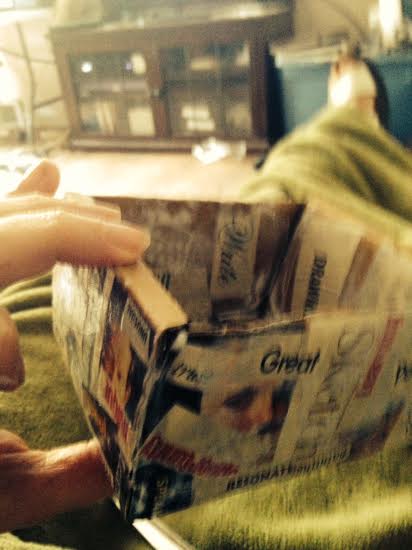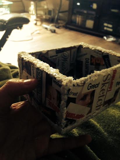 decoupaged cut out words and things to it, from an old magazine I’ve been keeping since 1995. Oh the varied fonts! Then I “aged” the box with gold paint and dipped the edges in mica dust. Lastly I sprayed it with gloss protectant. I’ve got a handy little box for barrettes, trinkets, and hair ties now. Here is the process: