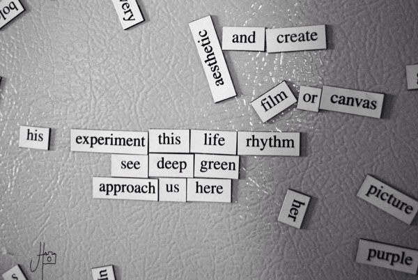 Anyone ever have a kit of these magnetic words that were/are available at Barnes and Noble; for the refrigerator? Interesting sentences can be made… I used to string together nonsense words, create poems, express woe, etc. etc. Then another person would come along and add their word to the sentence salad.