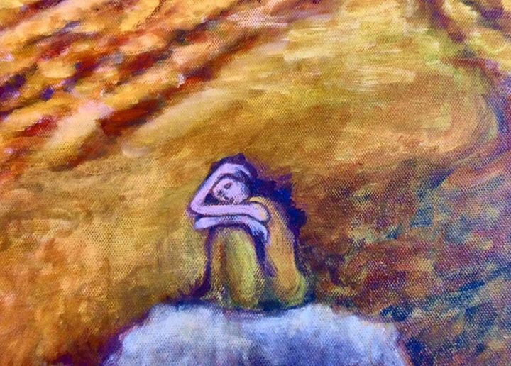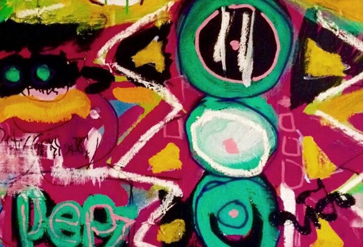 I’m honored to be in such fine company. Here are three paintings. The woman on a rock is mine. The mask and woman is Stefanie’s and the colorful abstract is Vito’s. I love the colors… The symbolism of Stefanie’s work and the graffiti feel of Vito’s.