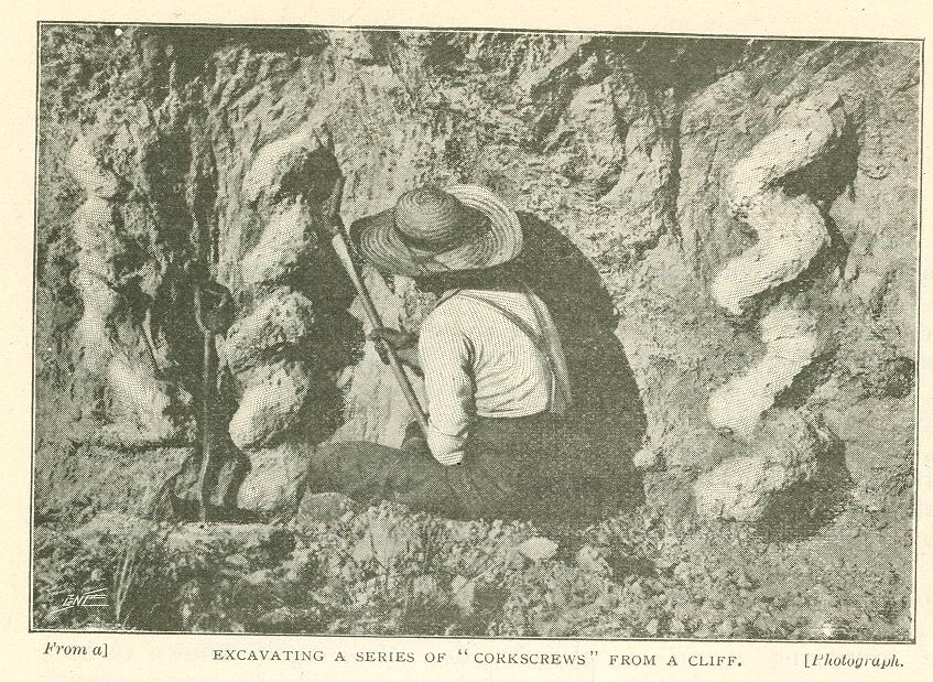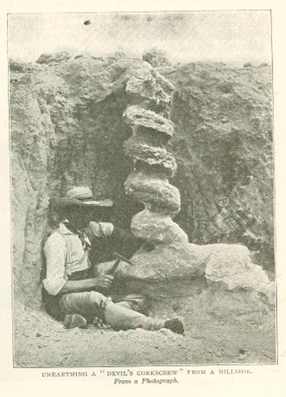“…..the eye is caught now and then by a huge spiral column of white stone standing out in relief from the side of a hill, and rising in an exact perpendicular, as if to uphold the rocky masses above. In places, scores of them are seen exposed on the face of a single cliff, always perfectly vertical—Within an area of about 500 square miles in Nebraska there are literally millions of these curious (spiral) objects, revealed to view by being “weathered out” of the sandstone formation. They are composed of quartz, and every one of them is carved out with a precision that might be expressed by a mathematical formula. They call these remarkable spirals “Devil’s Corkscrews” which seems fairly appropriate, in view of the total lack of explanation of them.”