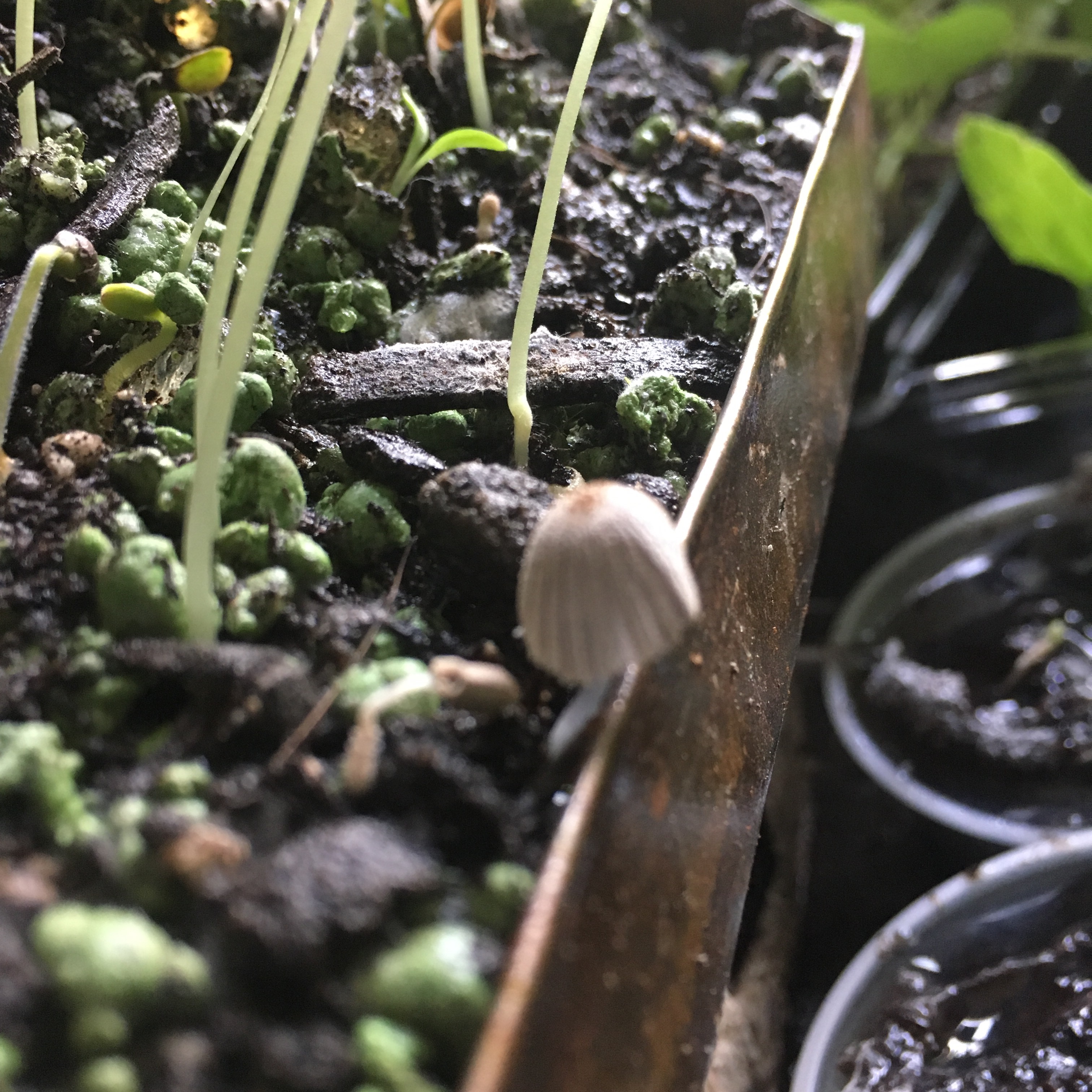 They actually grow when I’m not looking. Here is a totally unexpected little white mushroom that sprung up from the roof of my fairy house when I wasn’t looking. Can you see it?