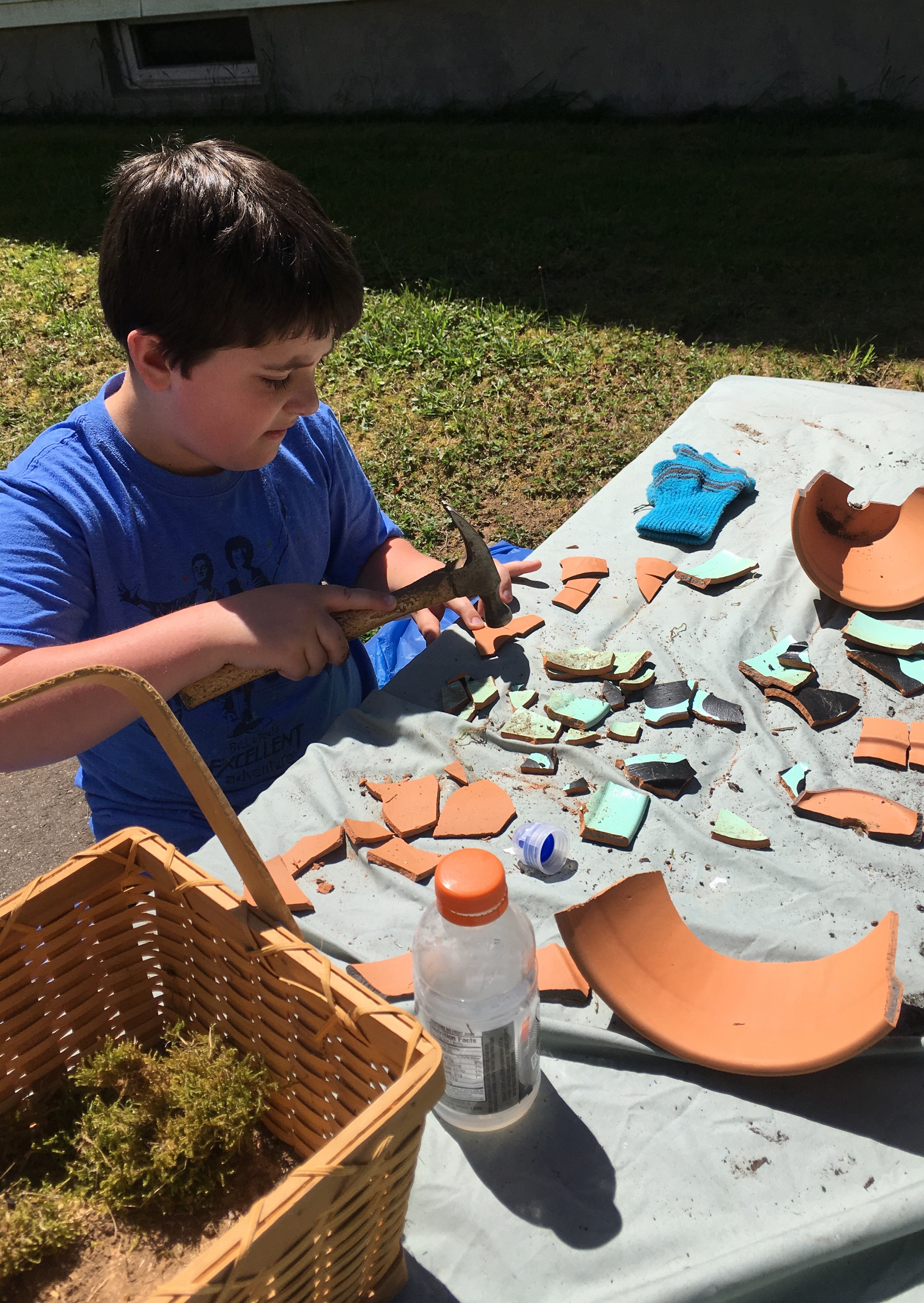 This particular part of the village is from terra cotta pots which my grandson loved smashing. The idea is that the green terra cotta bits are steps, but I am not finished with this just yet.