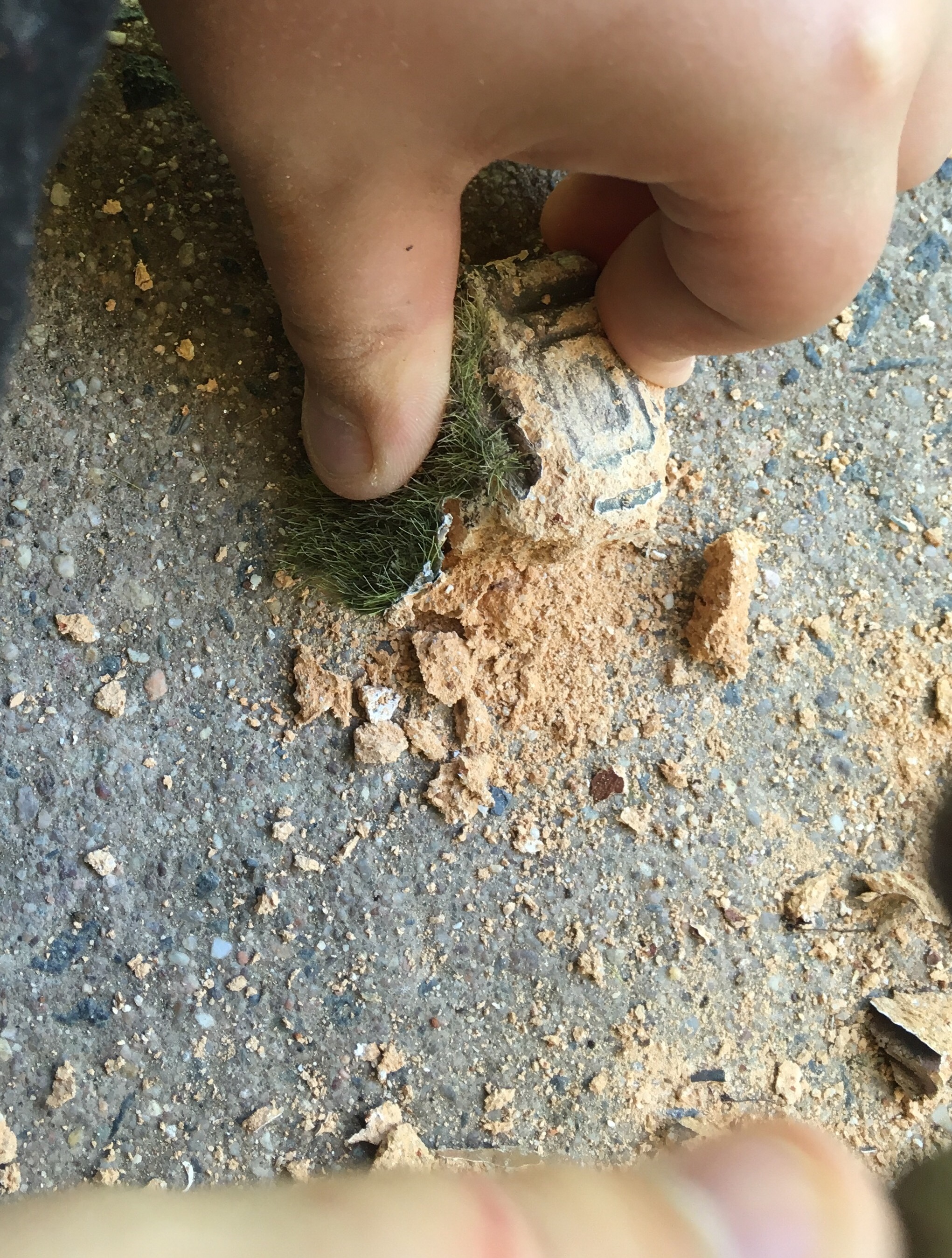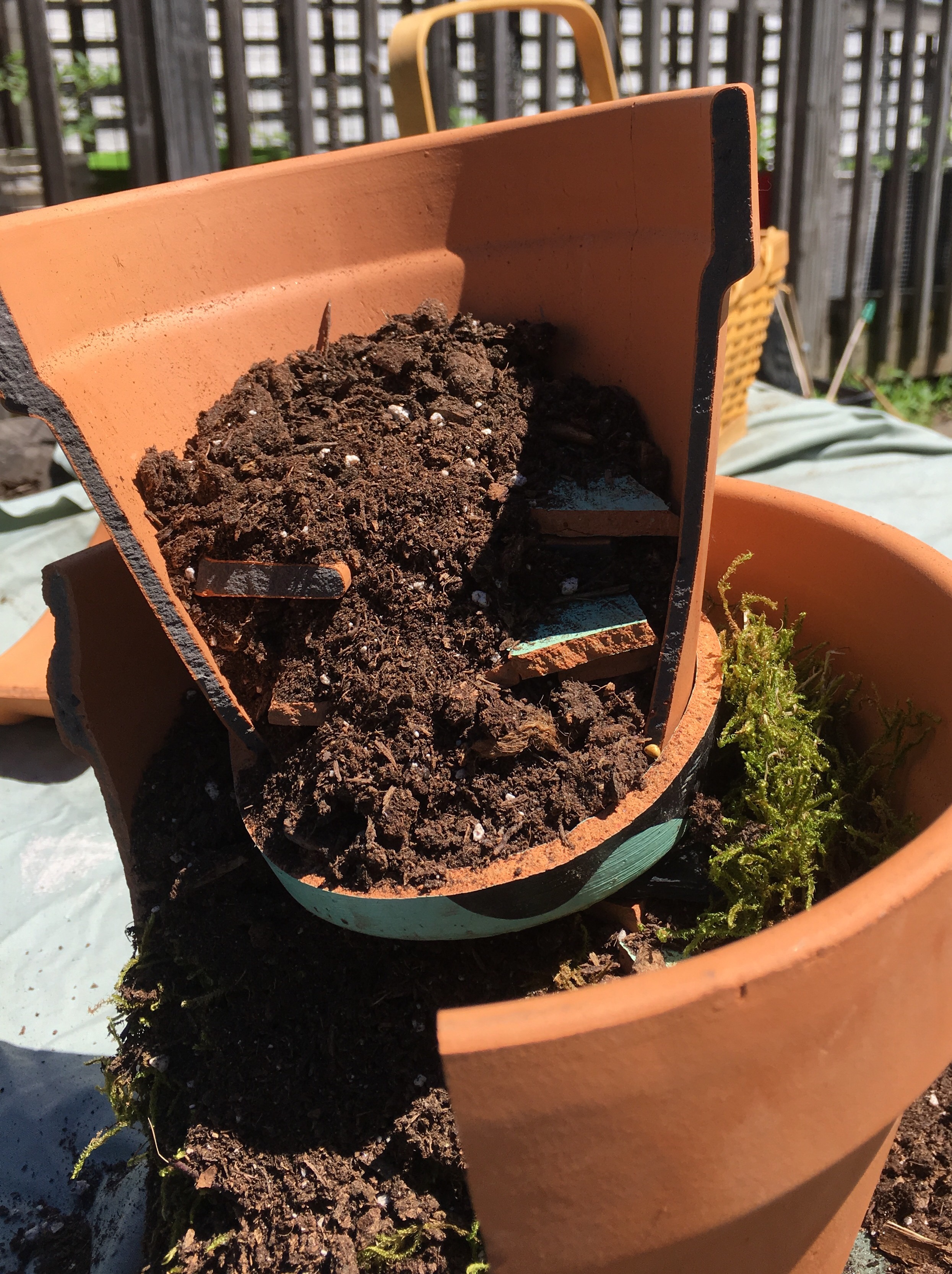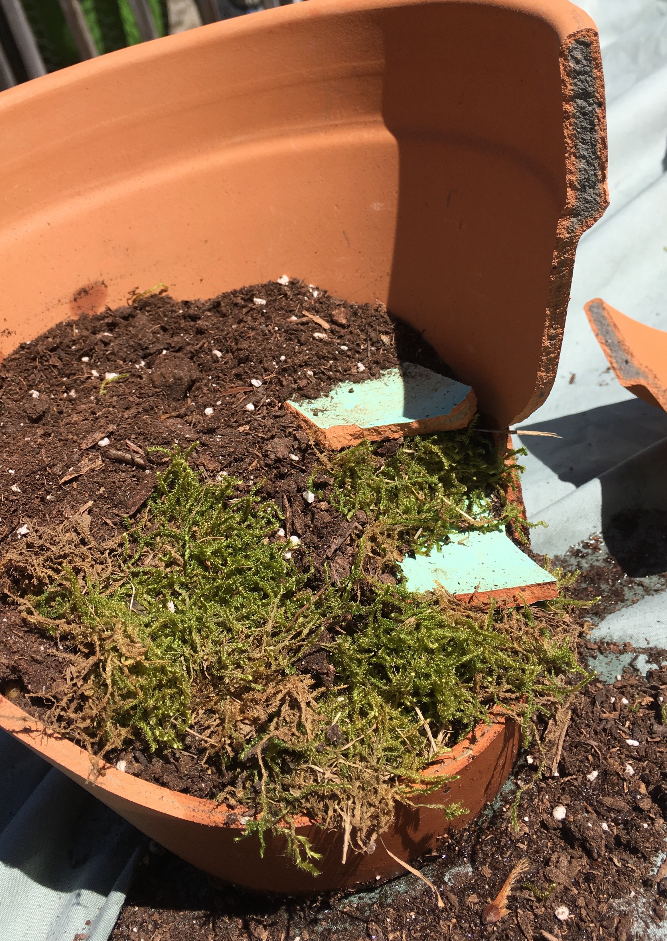 Is it any wonder I greet new people with “Wanna see my faery village?” I’m not ashamed of my enthusiastic demeanor, why should I be? Laugh if you like, but it fills my time. I suppose extroverts (of which I am not) refuel with interactions with people) and introverts like me (yay introverts) recharge with alone time. So here I go- sharing some of my faery stuff. When I use moss, transplanted from the shadow side of the house, I often transport ants to the project. That’s okay, I know it’s brimming with life, even if mostly unseen.