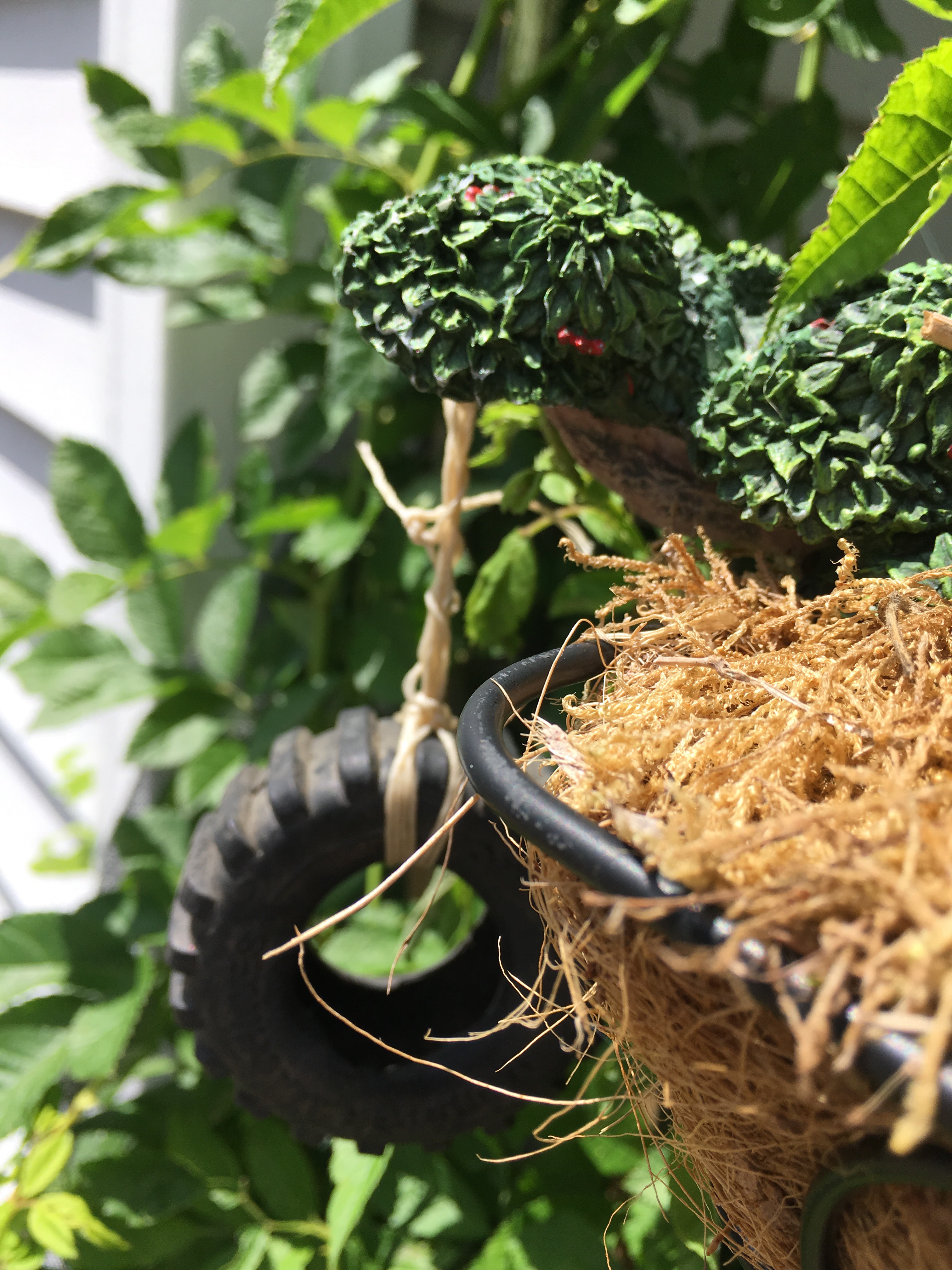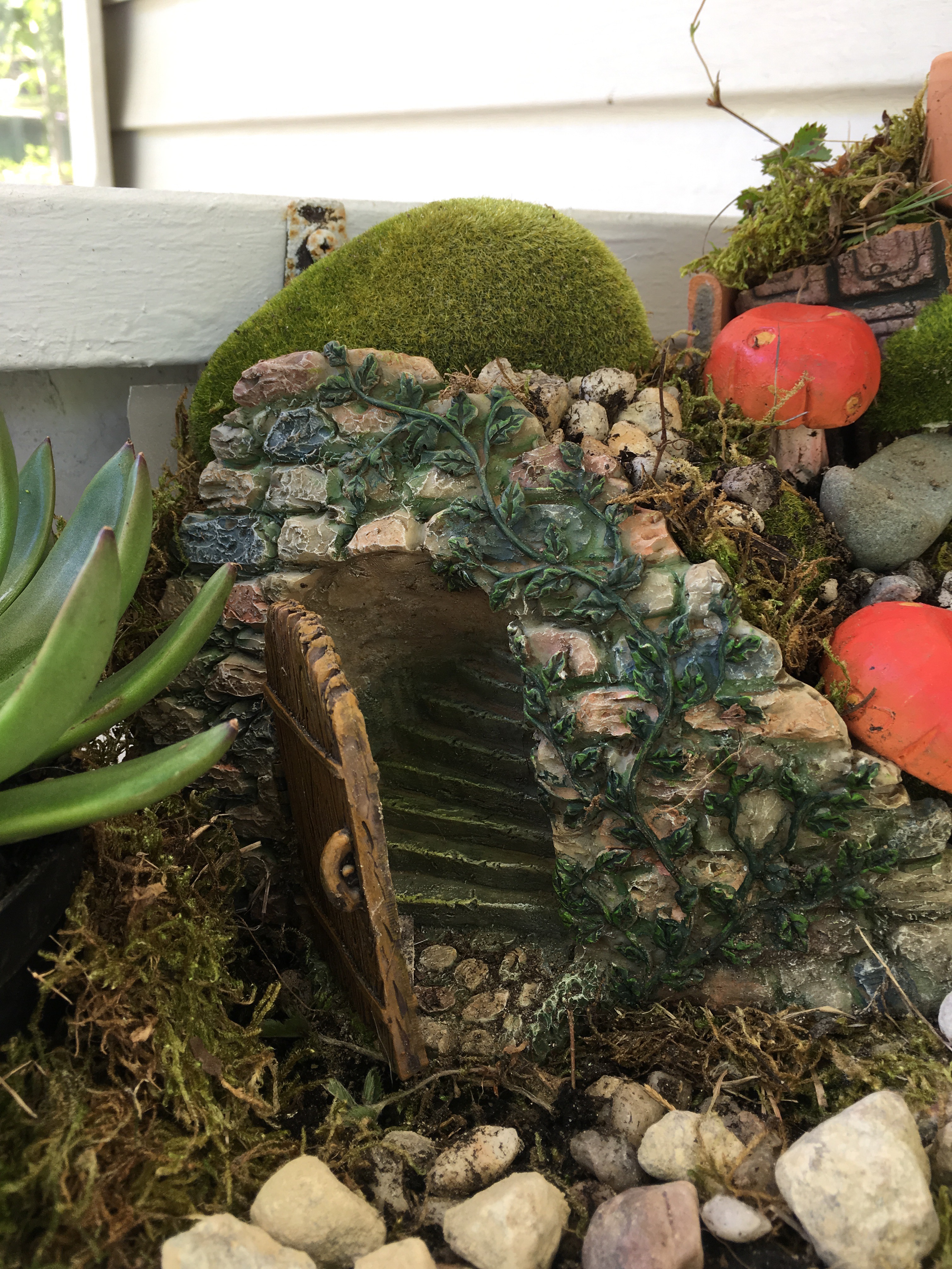 A secret doorway. Shhh. These succulents are real and thriving. The tire that I fashioned into a gnome tire swing, Al found in the road and brought home to me.