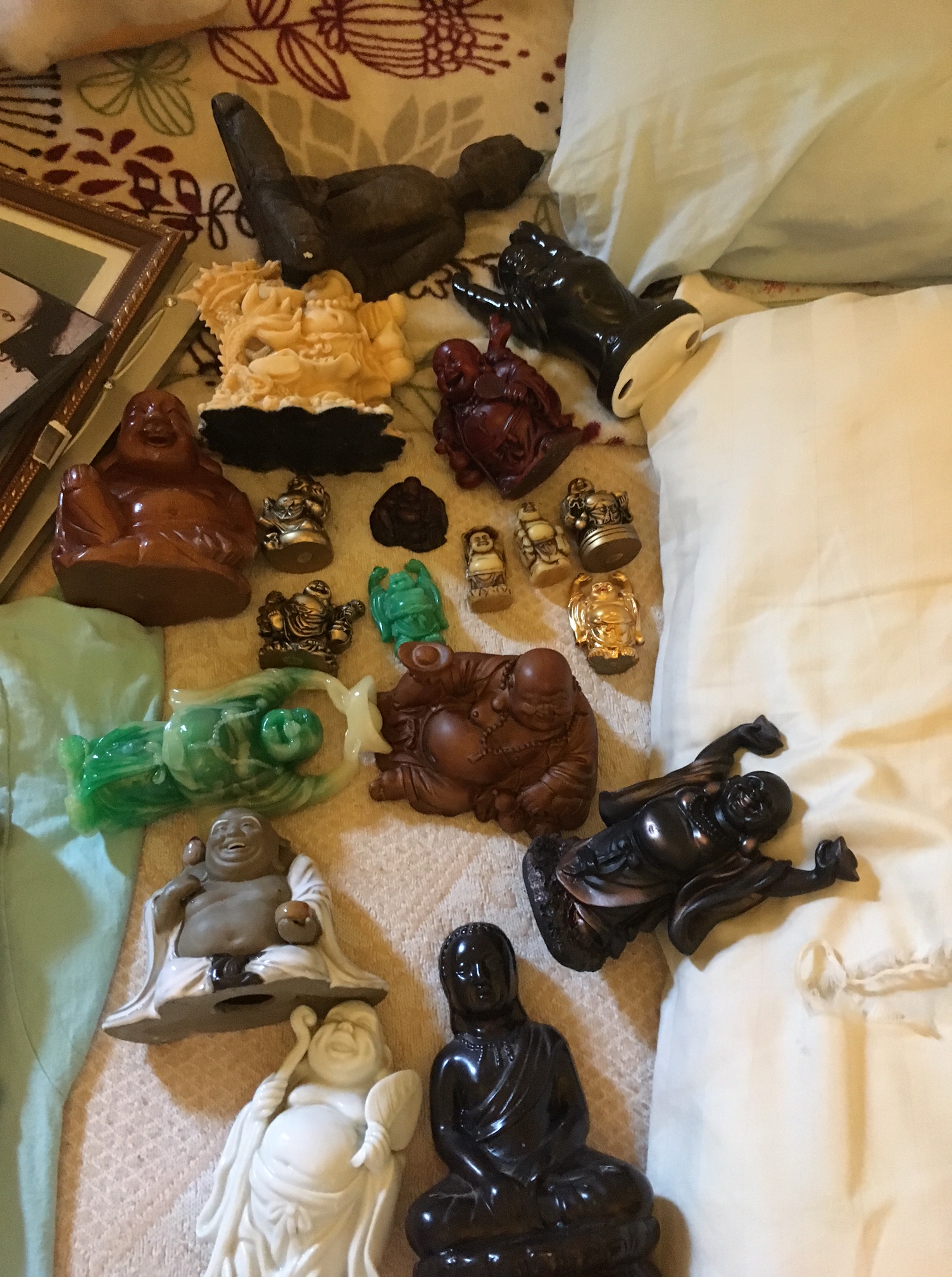 September sneaked up on me. I just had a few mini vacations: Vermont, NY, Massachusetts. And I got to walk on the beach this past summer. Now I understand that this is the last Autumn my Maple will drop leaves. It’s marked for murder. Every day the treecutters are closer and closer. September and February are big household cleaning times around here. Dust bunnies are given the old heave-ho. Crannies are attended to and niches are decluttered. This past week it was time for the Autumnal cleaning. A semi-annual cleaning of the Buddhas was had.