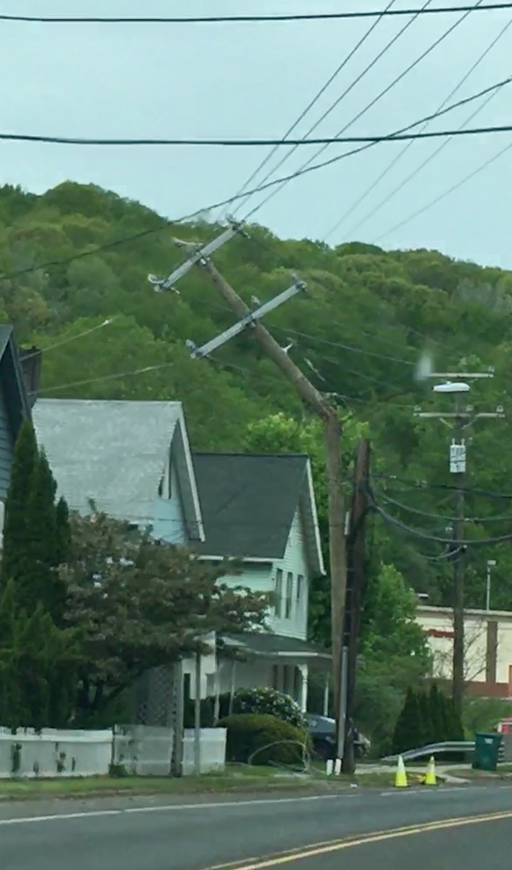 Downtown snapped pole. Looks like I cannot steal library WiFi for work as that road is still roped off from yesterday and besides no power anywhere 🙂