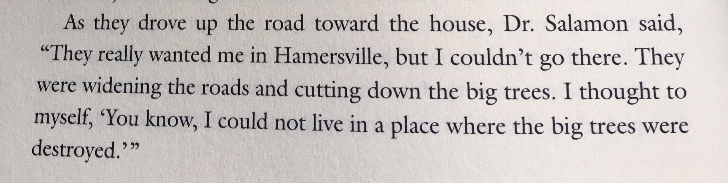 The book is “Net of Dreams,” about Holocaust survivors who, after their experience appreciate ALL aspects of life. The doctor muses in the book that tree cutters ruined the charm of the town he wished to settle in and at the sight of this, he had to settle elsewhere.