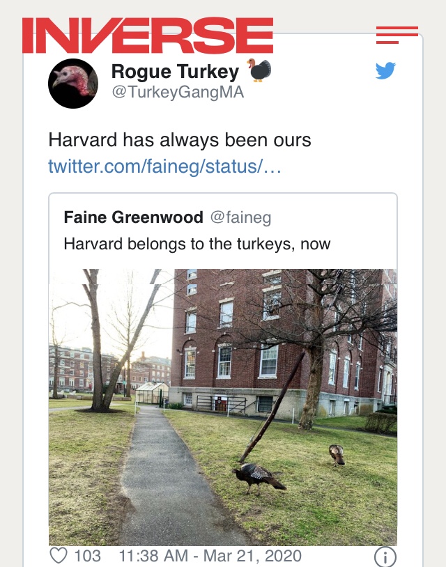 If you have time to read, here are some links to the earth healing due to Covid-19 and a few links to how animals are adapting. If you have any similar links, please post in the comments.