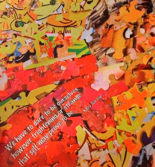 Here’s an activity I enjoy. Like Grant Manier, I enjoy using puzzles in my artworks. It is repurposing. It is eco-friendly. Here is my favorite part of the process: I search online, at thrift stores and I have puzzles -usually missing key pieces- given to me. Sometimes they are just precisely the group of colors I am looking for or the pieces have eyes on them, or bits of pieces of faces are on them. I get a comfy seat and put Baggies all around. Then I sort boxes and boxes of pieces into hues. I put different colors in each Baggie and store these Baggies in bins. Electric blue, yellow and red are special finds and all the pieces have snippets of other colors on them too but I sort according to what the prevalent color is on each individual piece. When I begin a project, I can grab bags of carefully selected different colors, the way someone might set up squirts of paint on a palette. Then I peel them and start gluing to make a picture.